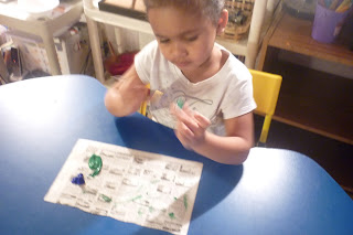 After the children collected their rocks. We painted them blue for water and green for land to represent our planet Earth. We have painted a lot here, but I have never witnessed the concentration the children had while completing this activity. Our rocks weren't big at all, they took a whole hour just painting their rocks. I loved every minute watching them absorbed in their work.